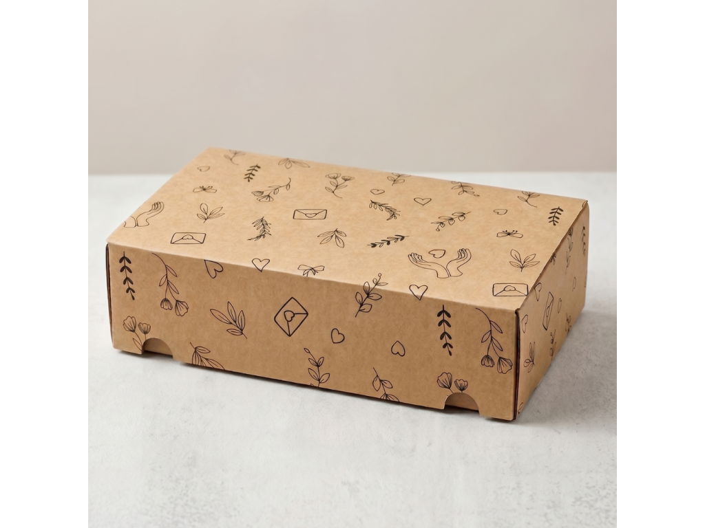 Box balíme do ekologické dárkové krabice z vlnité lepenky s květinovým vzorem, takže je okamžitě dárkově připravený — nepotřebujete další balicí papír ani stuhy.